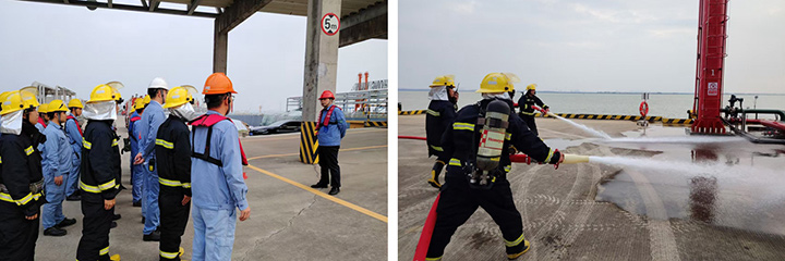 盛源石化、鸿源码头公司于5月2日17时30分开展管线泄漏火灾事故应急盲演,模拟码头管线法兰连接部位松动引发泄漏并起火,火势迅速蔓延。中控室接警后,第一时间上报并调整视频监控,启动应急预案。抢险救援组、专职消防队等迅速集结,穿戴防护装备抵达现场,切断电源,启动喷淋系统,架设消防水枪压制火势。演练全程历时20分钟,各环节衔接紧密,未出现指令延误或行动混乱,充分展现了企业日常严格训练的成效和救援队伍快速响应的能力。